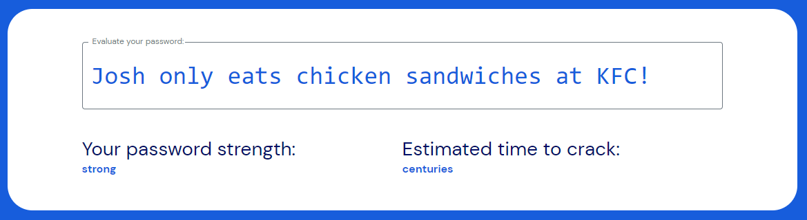 A simple passphrase brings our character count to 41 (spaces count as characters!), while also including a symbol to meet password strength requirements. This is a simple phrase that is rather easy to remember but nearly impossible to guess, and even more impossible to crack anytime this decade.